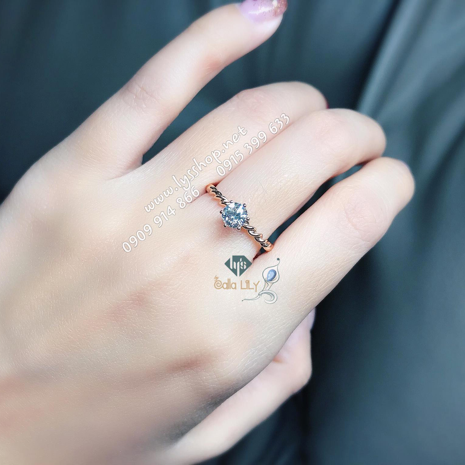 Nhẫn kim cương thiên nhiên 5 ly trắng trong, sạch đẹp! Vỏ nhẫn trơn 6 chấu đai xoắn đơn giản, vàng hồng 18k trẻ trung