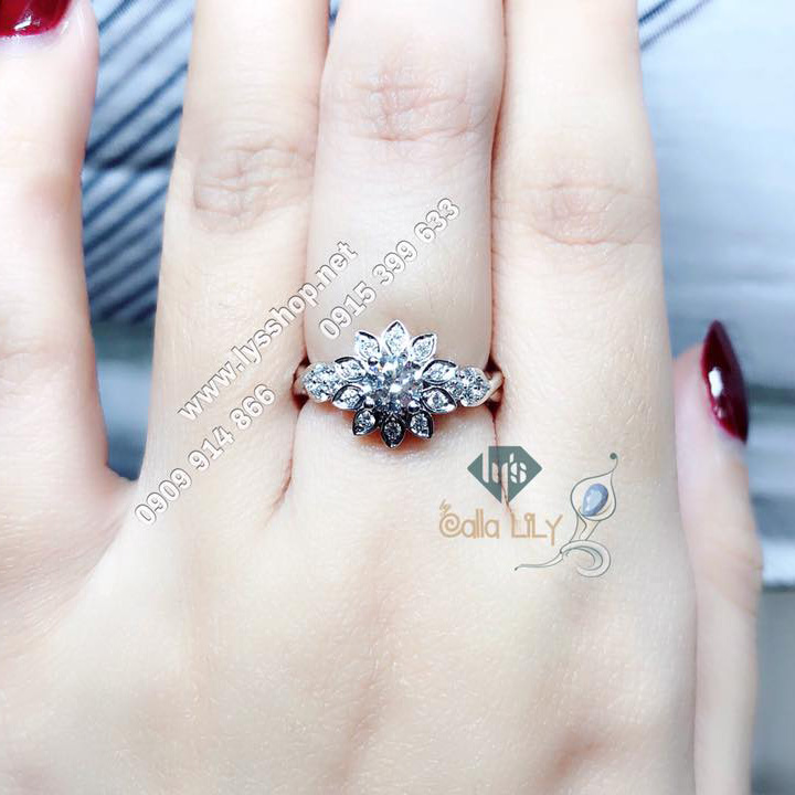 Nhẫn kim cương thiên nhiên với viên chủ 3,9 ly trắng trong, sạch đẹp! Ổ nhẫn bông hoa cánh nhọn xinh xắn, trẻ trung