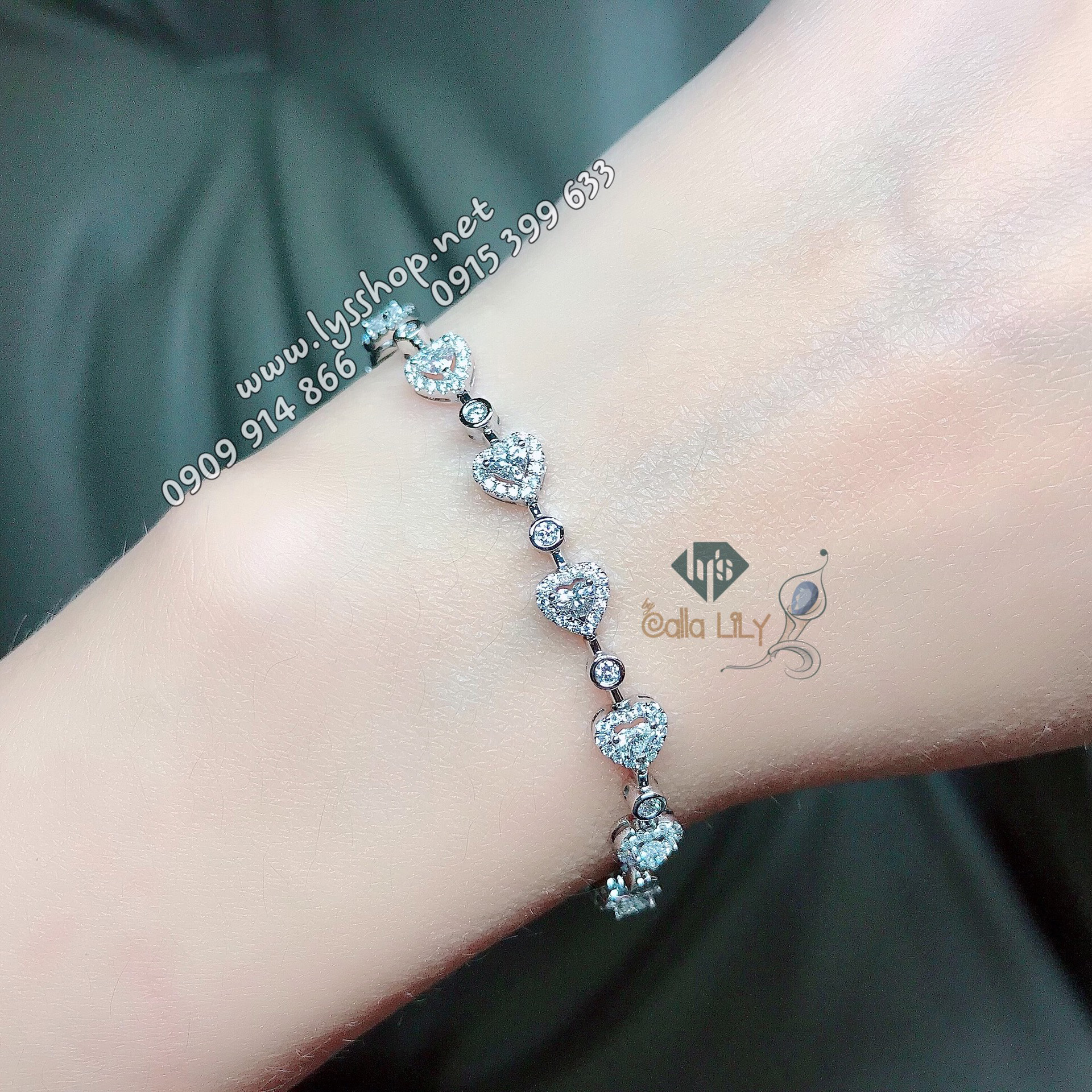 HÀNG ĐẶT 10-14 NGÀY Lắc tay với các viên kim cương thiên nhiên hình trái tim loại xuất sắc, sạch, trắng, cực xinh, được bọc halo kim cương tấm tôn size viên chủ, kiểu trẻ trung. Có thể làm vàng trắng, hồng hoặc vàng.